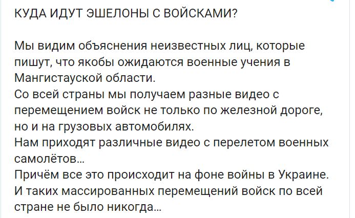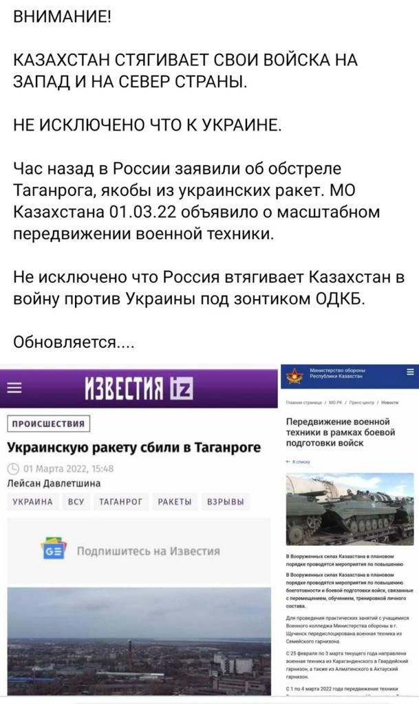 В мессенджерах распространяется сообщение о том, что Казахстан вступает в войну против Украины, стягивая войска на запад и север страны. Подтверждением тому якобы служат передвижения военной техники внутри Казахстана. Эту информацию опровергли в Минобороны РК, сообщает Stopfake.kz.