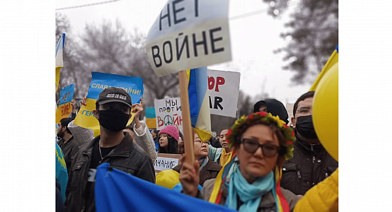 Около 2 тыс. человек собралось на митинг против войны в Украине в Алматы за кинотеатром «Сары-Арка». У большинства из них в руках флаги Украины, голубые и желтые шарики, антивоенные плакаты. Митинг начался с исполнения гимна Казахстана, затем участники начали скандировать «Нет войне!», «Слава Украине! Героям слава!». Этими же лозунгами заканчивается каждое выступление на сцене. Также фразой «Слава Украине! Героям слава!» участники митинга приветствовали друг друга, приходя на митинг.