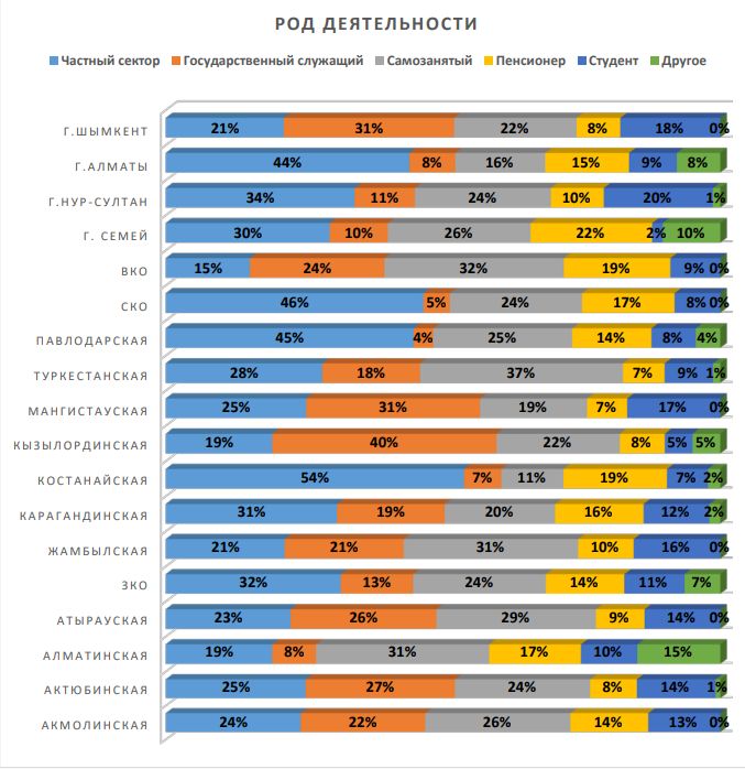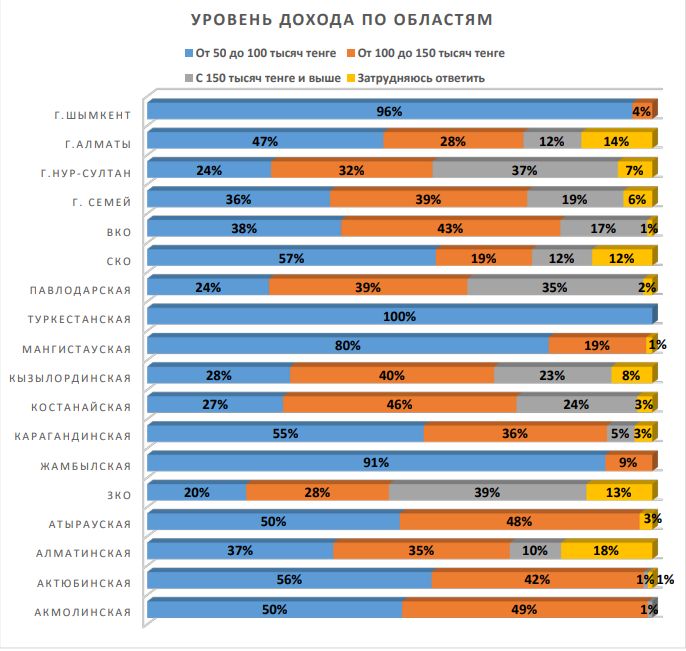 Фонд Qalam опросил 2 500 тысячи респондентов в 17 регионах, Алматы, Нур-Султане и Семее методом очного интервью (face to face). Исходя из выборочной совокупности было опрошено 60% городских и 40% сельских жителей, 47% мужчин и 53% женщин в возрасте от 18 до 65 лет, 61,5% казахов, 19,5% русских, а также 20% представителей других национальностей. 30% респондентов были занятых в частном секторе, 16,6% госслужащих, 25% самозанятых, 13% пенсионеров, 11% студентов. 52% имеют доход от 50 до 100 тысяч тенге на одного члена семьи, 29,5% – от 100 до 150 тысяч тенге, 12% от 150 тысяч и выше. Уровень дохода опрошенных: 62% – от 50 до 100 тысяч тенге, 25% от 100 до 150, 7% от 150 и выше. Ниже мы знакомим вас с результатами опроса по нашему региону. Cсылка на общие итоги опроса https://www.exclusive.kz/expertiza/politika/128781