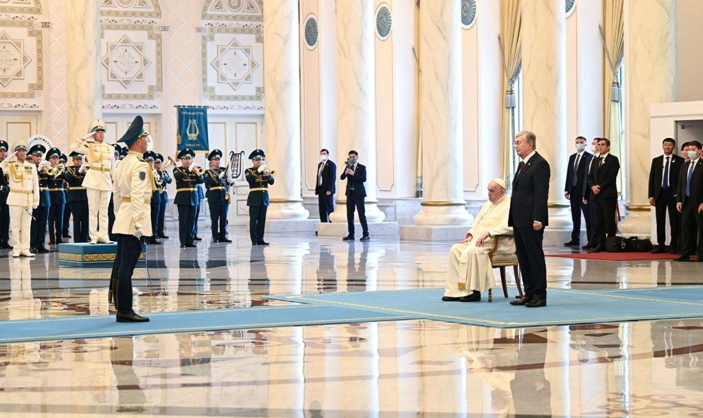 Переговорам предшествовала официальная церемония встречи Понтифика во дворце Президента. После того как начальник роты Почетного караула отдал приветственный рапорт, прозвучали государственные гимны двух стран. Касым-Жомарт Токаев и Папа Римский совершили обход Почетного караула. Затем в Восточном зале состоялись двусторонние переговоры.