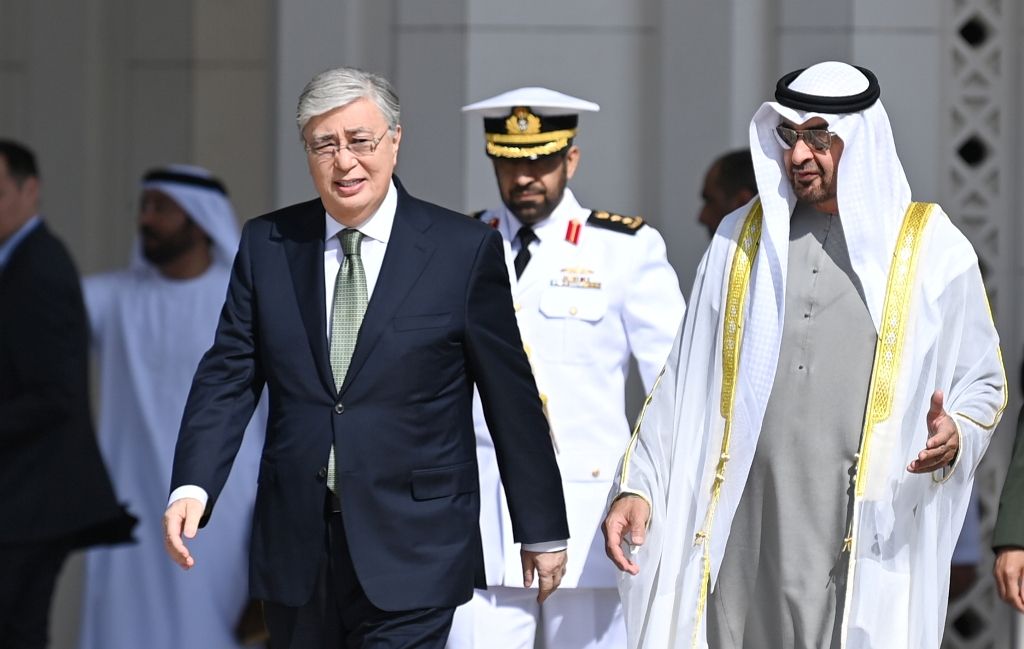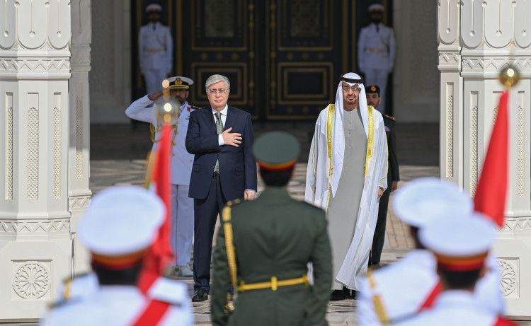Официальная церемония встречи президента Казахстана прошла перед дворцом «Аль-Ватан». В честь прибытия главы государства был произведен 21 артиллерийский залп и исполнен государственный гимн Казахстана. Касым-Жомарт Токаев и шейх Мухаммед бен Заид Аль Нахаян тепло поприветствовали друг друга. Затем командир роты почетного караула отдал рапорт. После представления членов официальных делегаций двух стран Касым-Жомарт Токаев оставил запись в Книге почетных гостей.