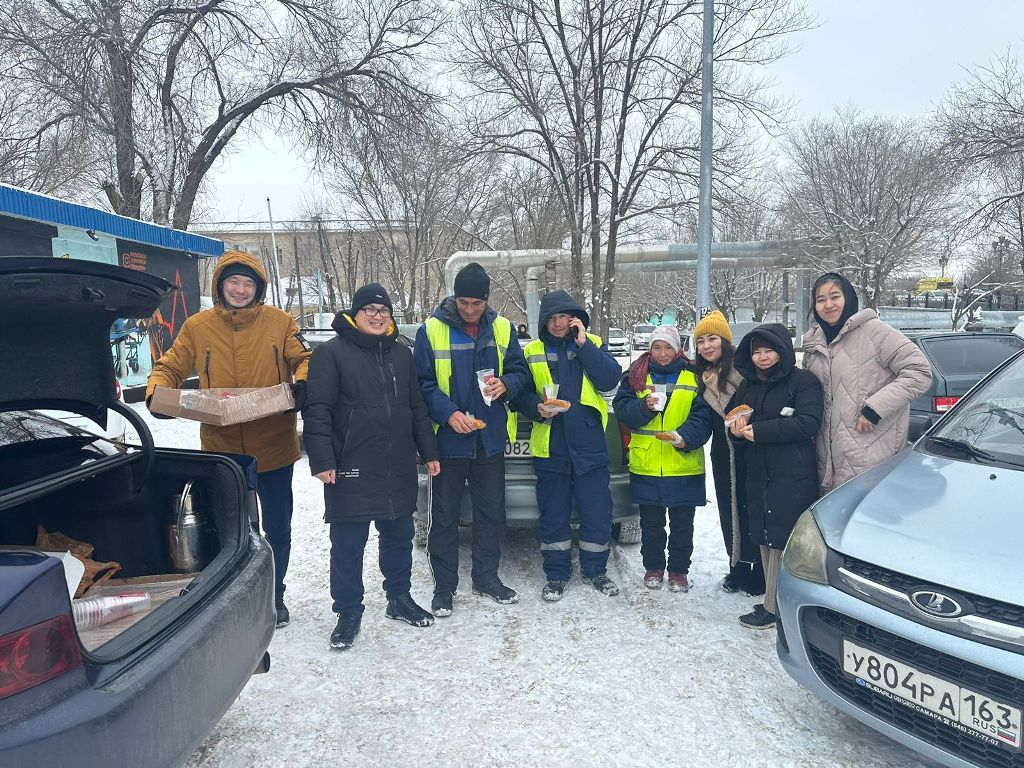 И вот только что увидела: волонтёры напоили горячим чаем с пирожками работников «Спецавтобазы», которые на лопатах.