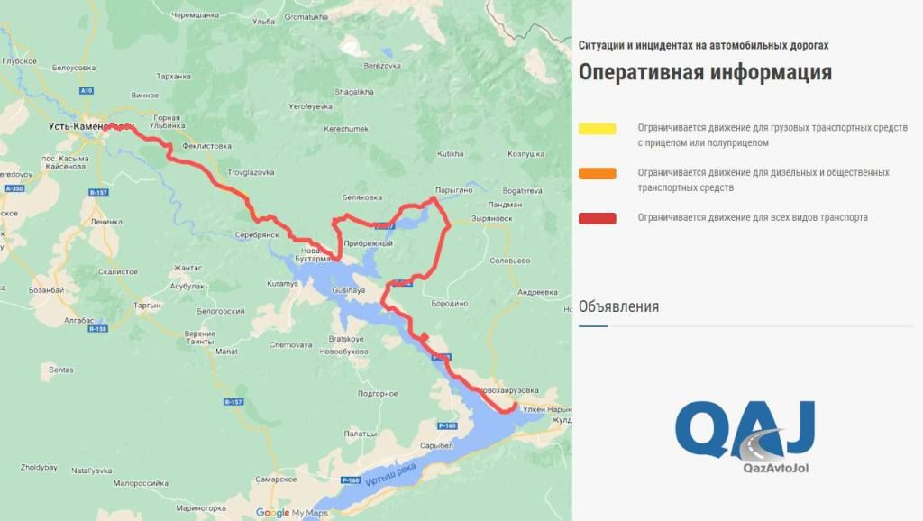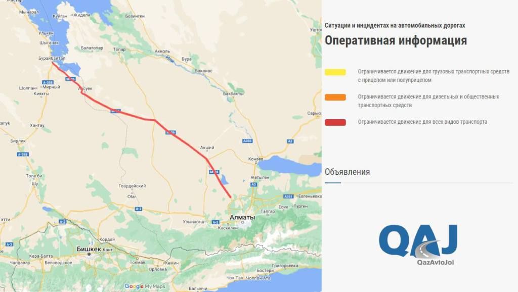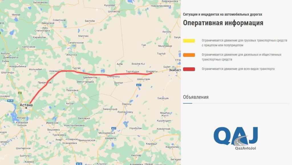 «В связи с непогодой (метель, ограниченная видимость), проведением профилактических работ по спуску снежных лавин и переливом талых вод движение ограничено на автодорогах республиканского значения в Акмолинской, Актюбинской, Алматинской, Восточно-Казахстанской, Жамбылской, Западно-Казахстанской и Павлодарской областях.