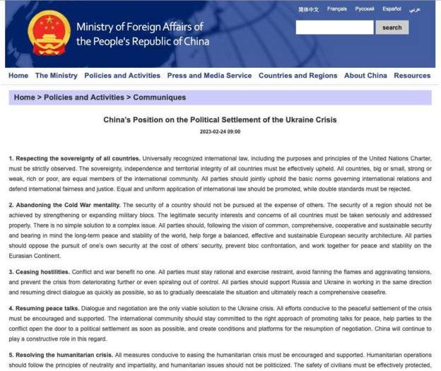 В годовщину нападения России на Украину МИД Китая опубликовал свою "позицию относительно урегулирования украинского кризиса", передает BBC News. Это не план урегулирования с конкретными предложениями, которого ждали от Китая после выступления его представителя на Мюнхенской конференции, а именно позиция, изложенная в виде общих слов, призывов и пожеланий.