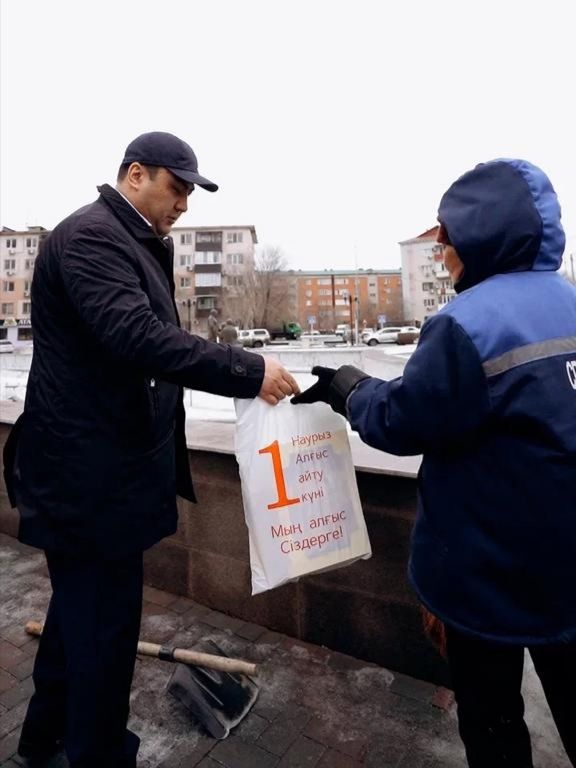 – Сегодня – первый день весны и День благодарности, мы хотели порадовать этих людей, – говорит руководитель управления Азамат МАМБЕТОВ. – Последние недели были для них непростыми: прошёл большой снегопад, теперь потеплело и всё тает, поэтому работы у них хоть отбавляй. И мы подарили этим труженикам всякие сладости.