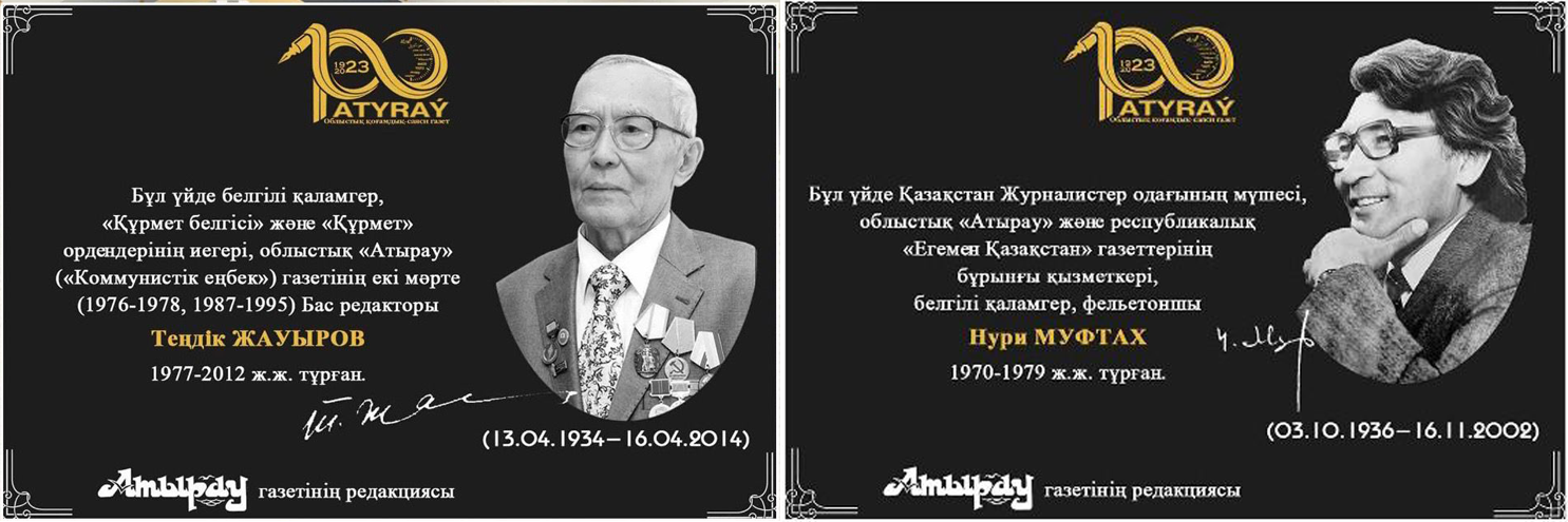 В этом году областная общественно-политическая газета «Атырау» отмечает свой 100-летний юбилей. К этой знаменательной дате на домах, где жили известные журналисты Нуриден МУФТАХ и Тендык ЖАУЫРОВ, 31 марта были установлены мемориальные доски.
