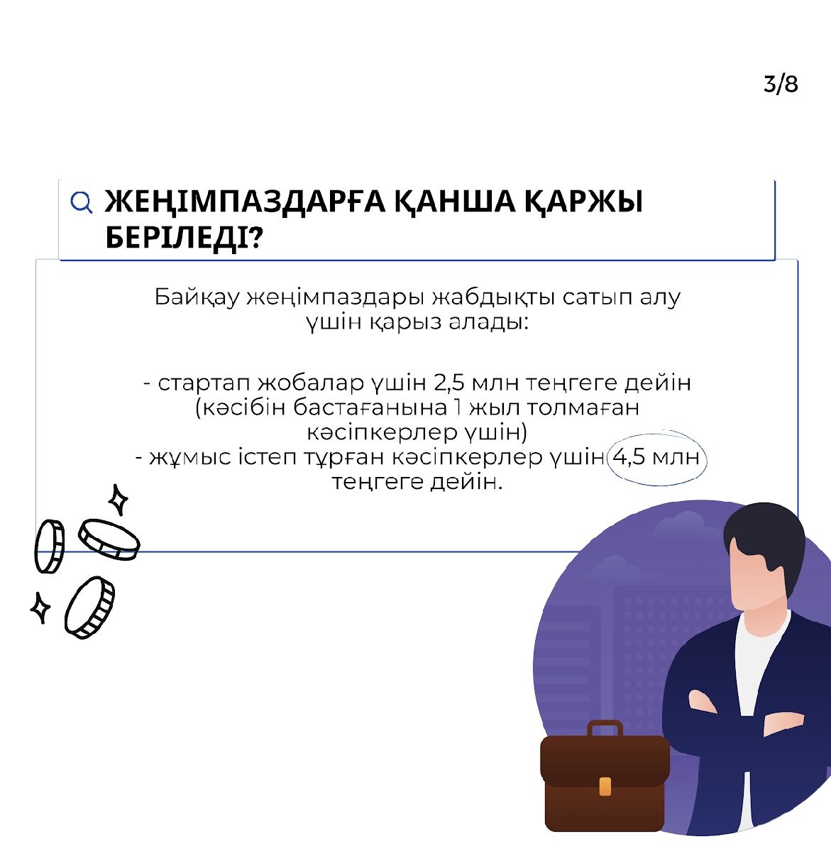 - до 2,5 млн тенге для стартап (молодых) проектов (предприниматели, осуществляющие свою деятельность менее года)