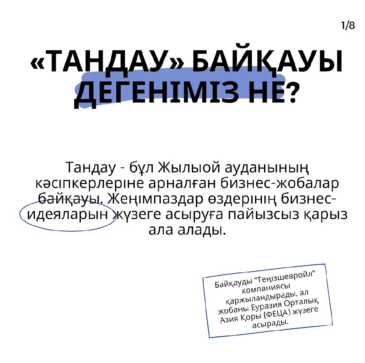 Проект, получивший название “Тандау” - конкурс бизнес-проектов для предпринимателей Жылыойского района, победители которого смогут получить беспроцентные займы на осуществление своих бизнес-идей.
