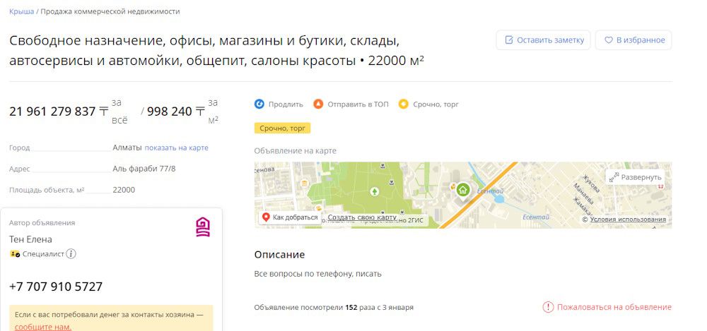 Причём в заголовке автор объявления – Елена ТЕН - не упоминает название объекта, ограничившись описанием его функционала: "Свободное назначение, офисы, магазины и бутики, склады, автосервисы и автомойки, общепит, салоны красоты, 22 000 кв.м". Вся эта коммерческая площадь оценивается почти в 22 млрд тенге – почти по миллиону тенге за квадратный метр. При этом адрес объекта указан именно по которому располагается ТЦ Esentai Mall – проспект аль-Фараби, 77/8.