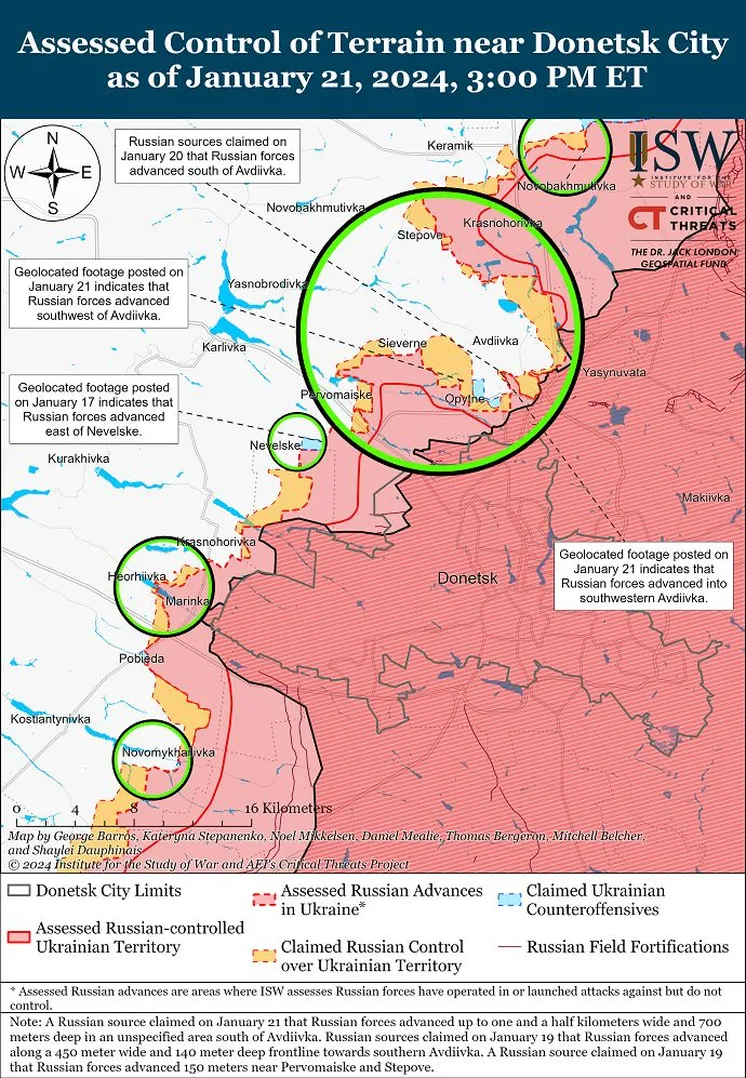 На геолокационных кадрах, опубликованных 21 января, видно, что российские войска продвинулись в районе ресторана "Царская охота" вдоль улицы Соборной (на юге Авдеевки) и вдоль полосы деревьев на юго-западе Авдеевки, говорится в отчете Института изучения войны (ISW), передает «Украинская правда».