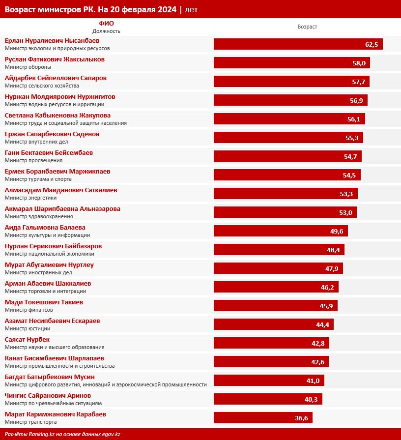 Самый «возрастной» — министр экологии и природных ресурсов Ерлан Нуралиевич Нысанбаев: 62,5 года. На второй и третьей строчках оказались министр обороны Руслан Фатихович Жаксылыков (58 лет) и министр сельского хозяйства Айдарбек Сейпеллович Сапаров (57,7 года).